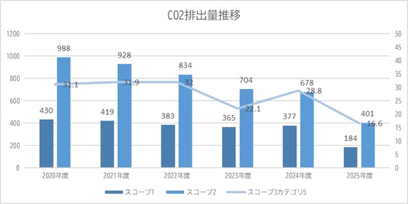 当社、環境への取り組みに基づくサスティナブルな活動より 2025年度co2排出量累積 601.6t-co2スコープ1:184.0t-co2スコープ2:401.0t-co2スコープ3カテゴリ5:16.6t-co2再生可能エネルギー率 18.5%